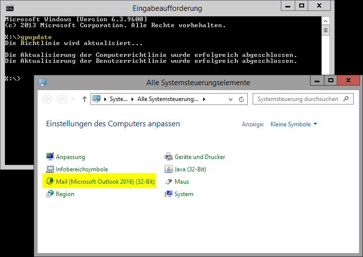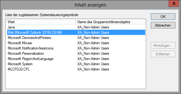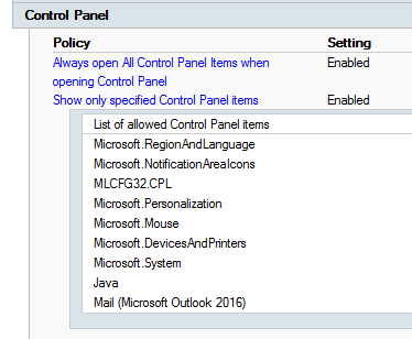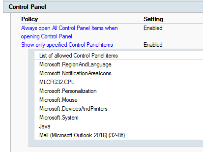 …enabled in every environment. This acts as a whitelisting for the control panel items, so the user only has access to those items, that matter to him.The surprise was, that the control panel item for Outlook 2016 was missing, although we configured it in the corresponding GPO: