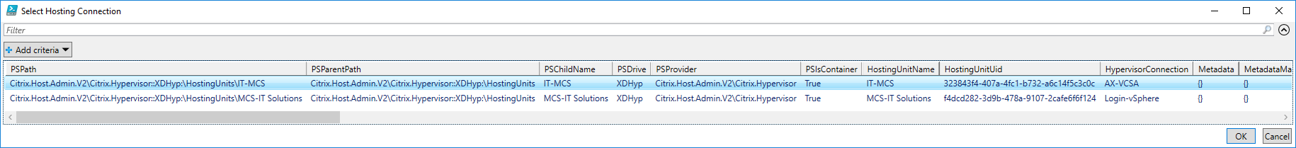 $Hosting = Get-ChildItem | Out-GridView -PassThru -Title "Select Hosting Connection" | Select-Object -Property HostingUnitUid