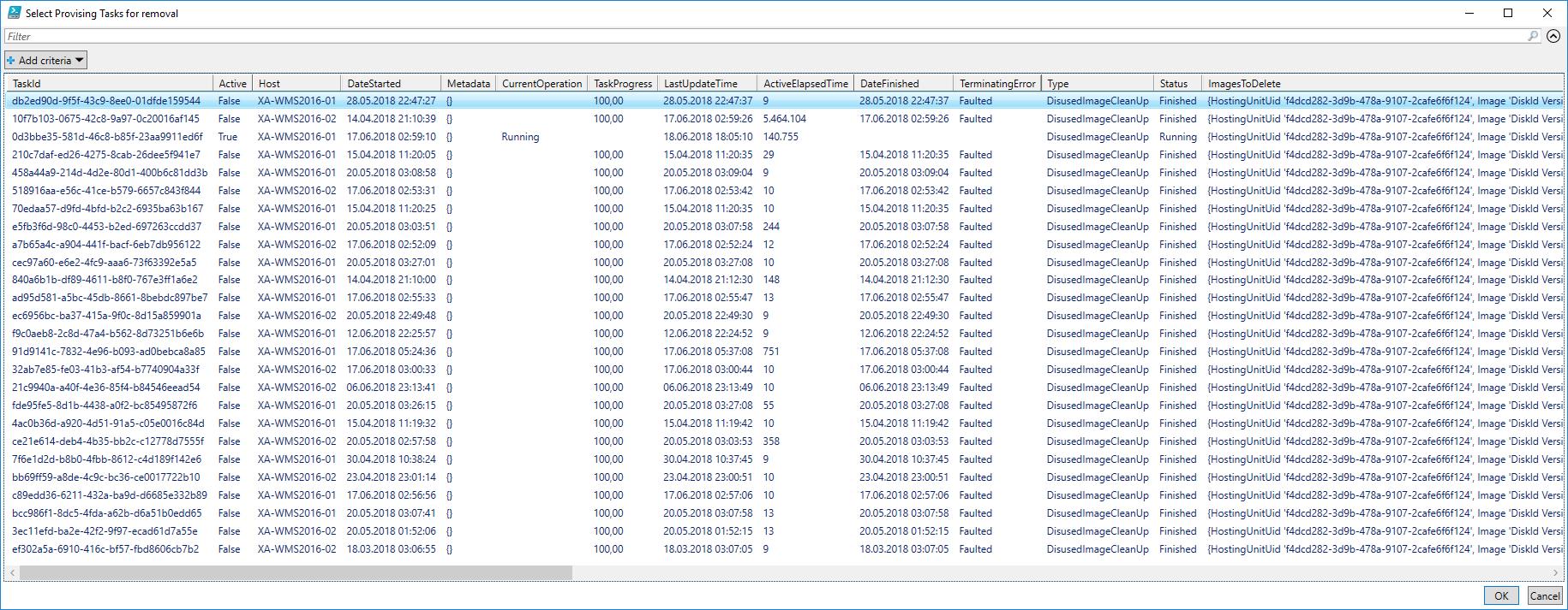 In the Out-GridView you will first select the affected Hosting connection and in the second windows you will select all ProvTasks you may want to remove. Most of the time this will be all. There are certainly better ways to solve this, but the intend of this post is just to show you with how little work a repetitive task can be optimized with simple PowerShell tricks.